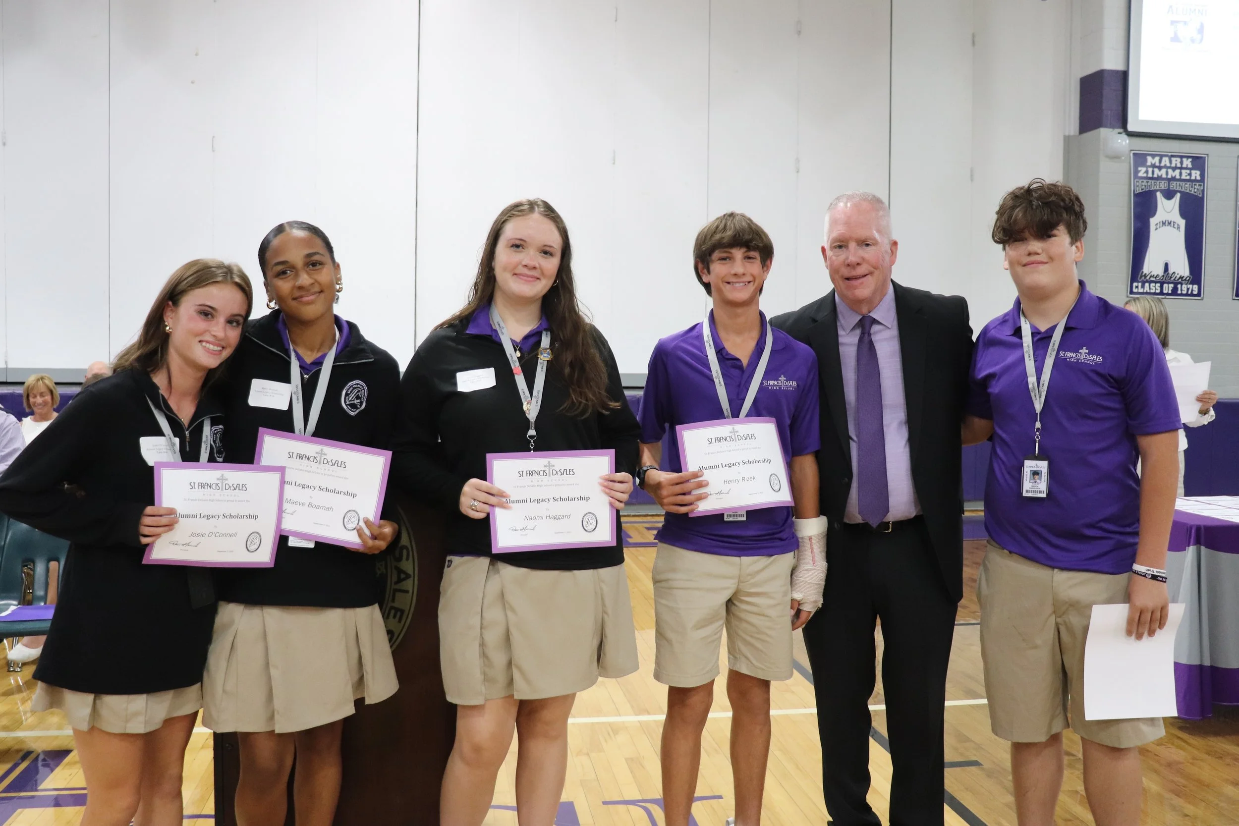 Pictured from left to right: Josie O’Connell (St. Paul School), Maeve Boamah (Perry MS), Noami Haggard (Immaculate Conception School), Henry Rizek (St. Paul School), Dan Garrick ‘79 (SFD Alumni Board & Council), Mason Danielson (St. Josephine Bakhita School)